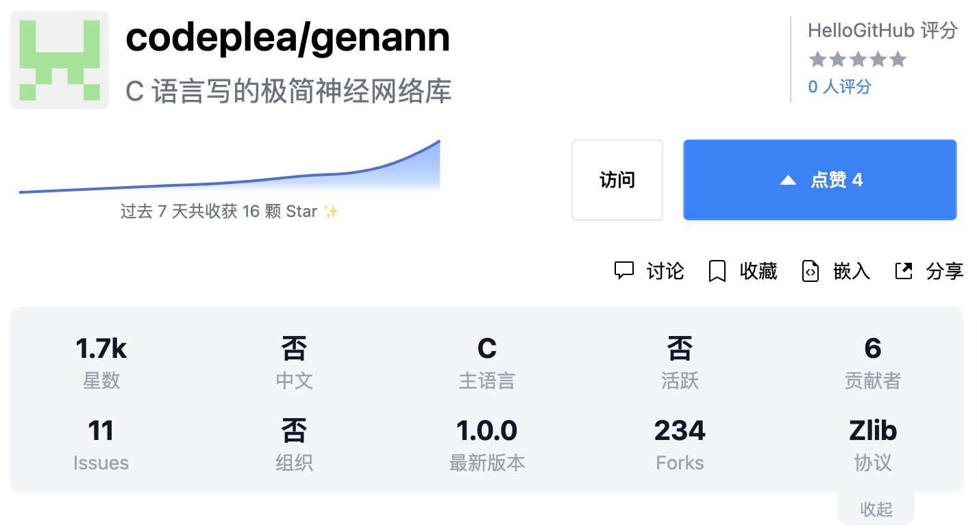 最后,还有一个 C 语言写的极简神经网络库和迷你 Python 项目集合,让刚接触编程的朋友也有可以把玩的开源项目。