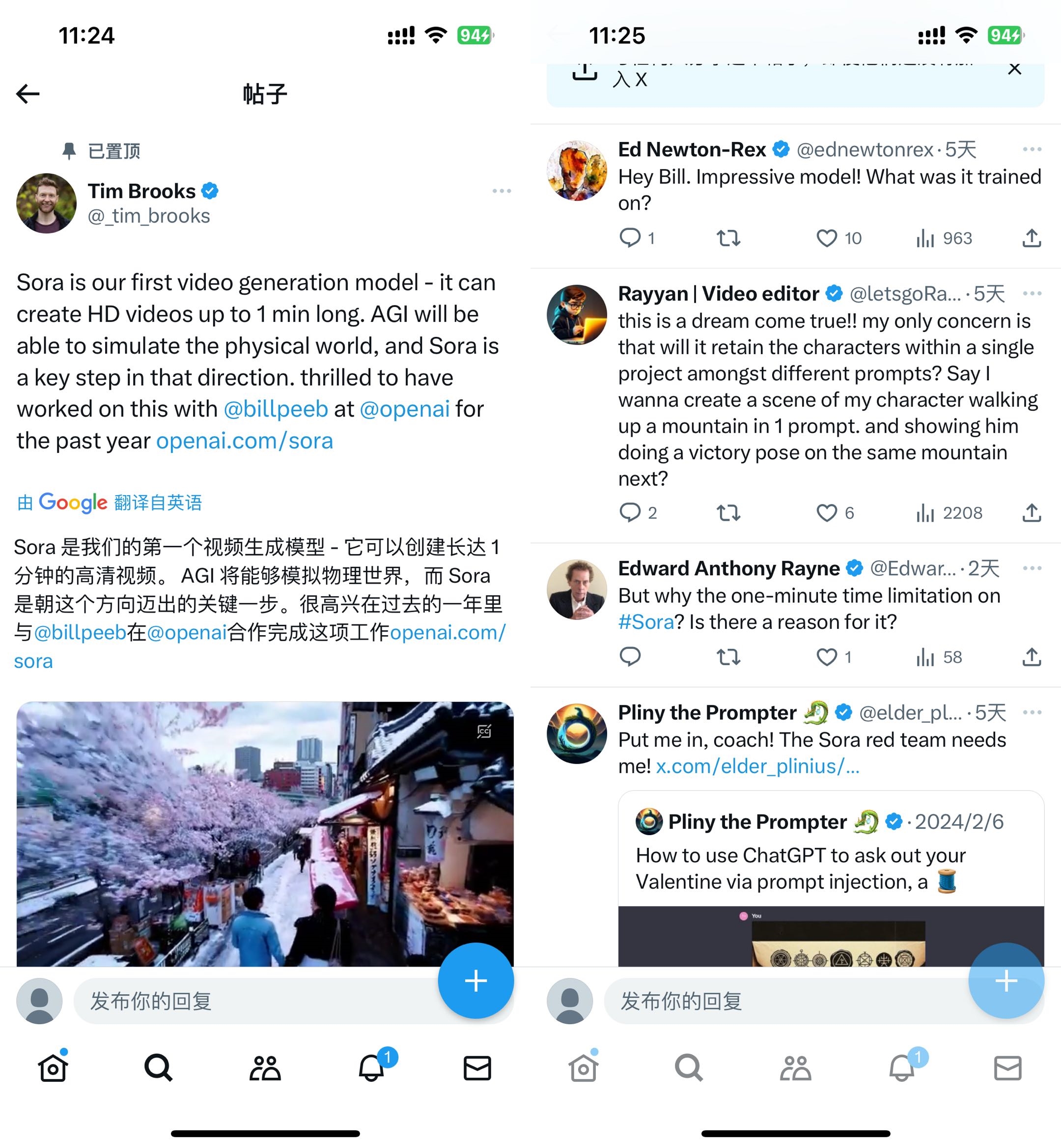 Tim在X上的社交帐号上发布了Sora的视频,评论区也是热潮不断,彻底的引爆了24年初的话题