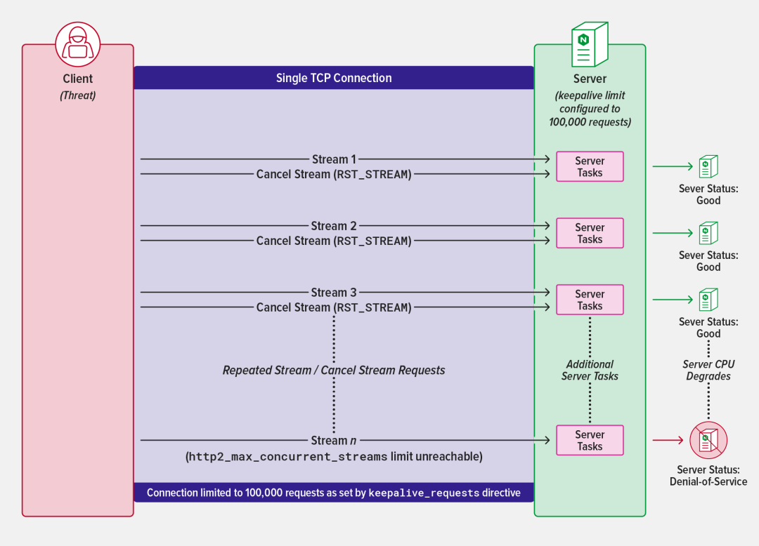 利用该漏洞进行攻击的方法是通过已建立的连接启动并快速取消大量 HTTP/2 数据流,从而绕过服务器对并发流的最大值限制。由于传入数据流的重置速度快于后续数据流的抵达速度,因此客户端能够绕过服务器的配置阈值,达到使服务器超载的目的。