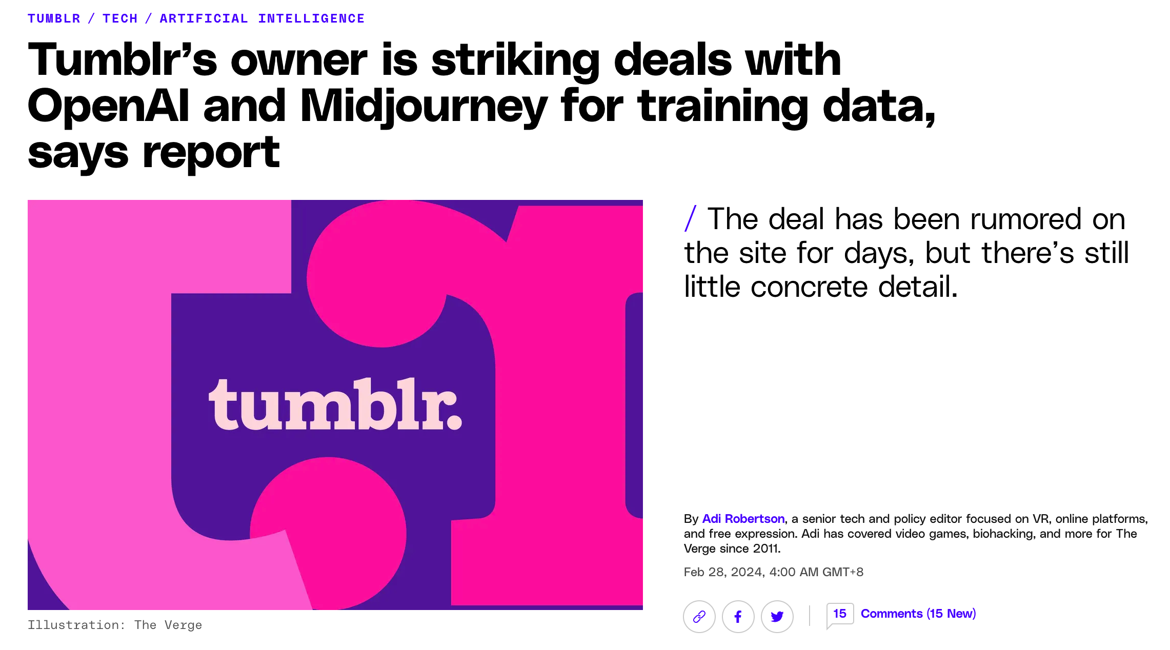 404 Media 的一份报告显示,Tumblr 和 WordPress.com 的所有者正在与人工智能公司 Midjourney 和 OpenAI 进行谈判,以提供从用户帖子中抓取的训练数据。