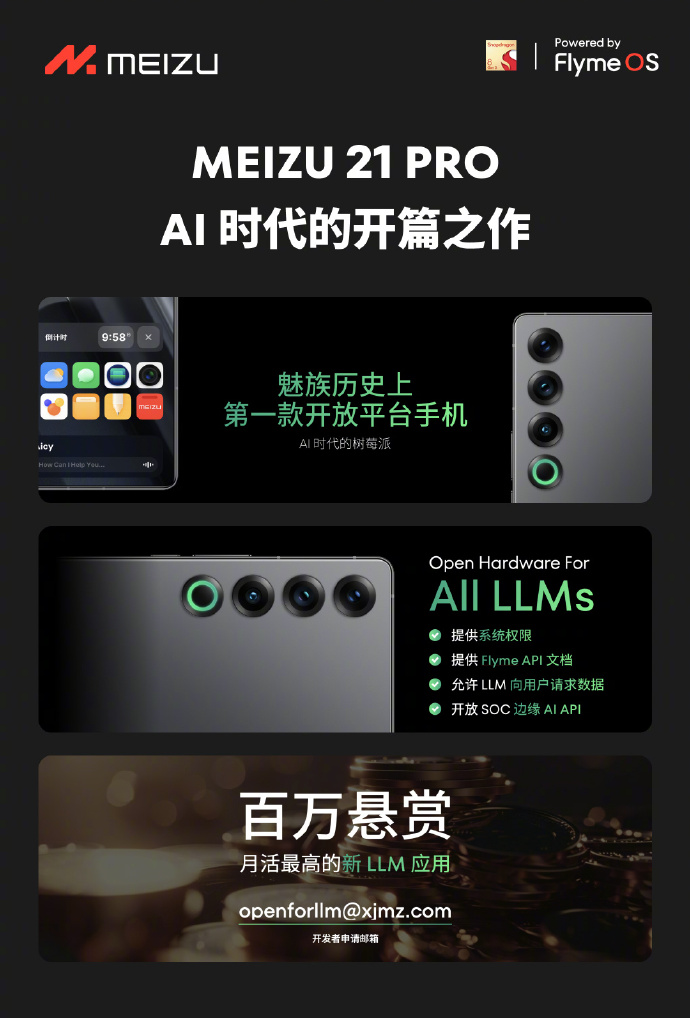 魅族称其是公司历史上首个开放式 AI 终端,并面向所有的大模型团队进行开放,向开发者提供系统权限、API 文档,并开放处理器的 AI 算力。魅族「百万悬赏」计划也宣布同步启动,邀请更多团队基于魅族开放平台开发大模型应用。