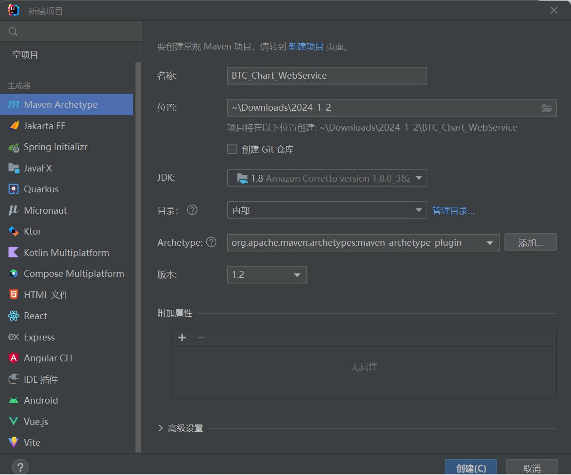 (2)为项目输入项目名称“BTC_Chart_WebService”,并在左侧菜单中选择Maven Archetype后选择一个项目存放位置,然后点击下一步。