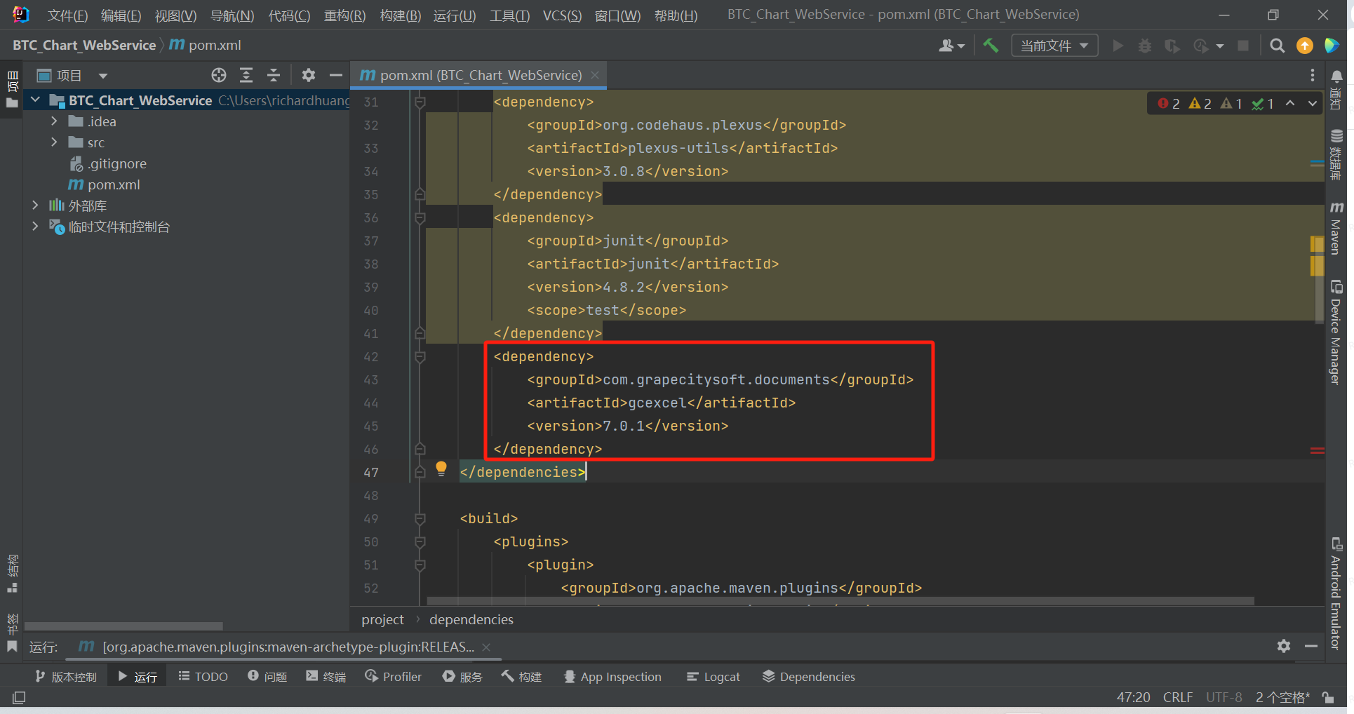(3)打开pom.xml文件并添加GcExcel依赖项
