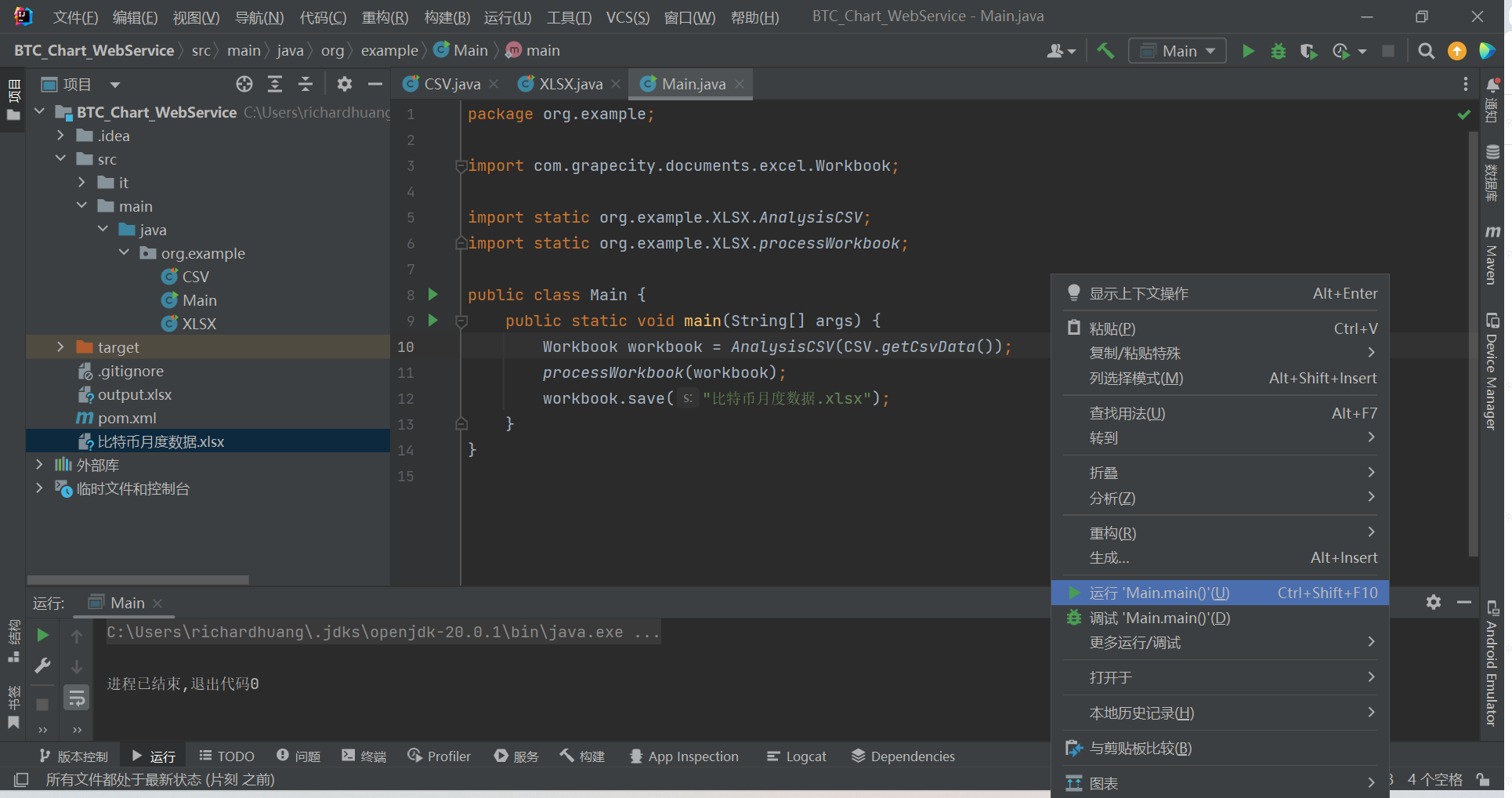 最后,创建一个Main类,并添加相关方法作为整个程序的入口,右键执行程序后就可以获得最终的Excel XLSX文件。