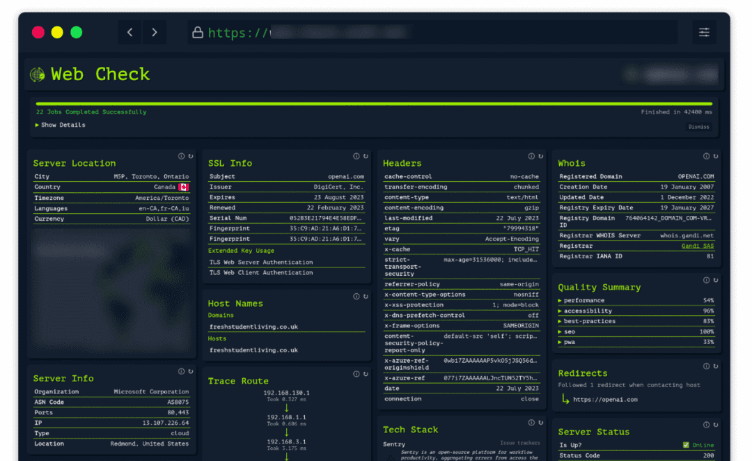 这是一款网站检查工具,可以显示指定网站更多的信息。比如:DNS 记录、服务器位置、站点性能、SSL 证书、性能、SEO 等信息,可用于分析网站的服务器架构、查看安全漏洞等场景。