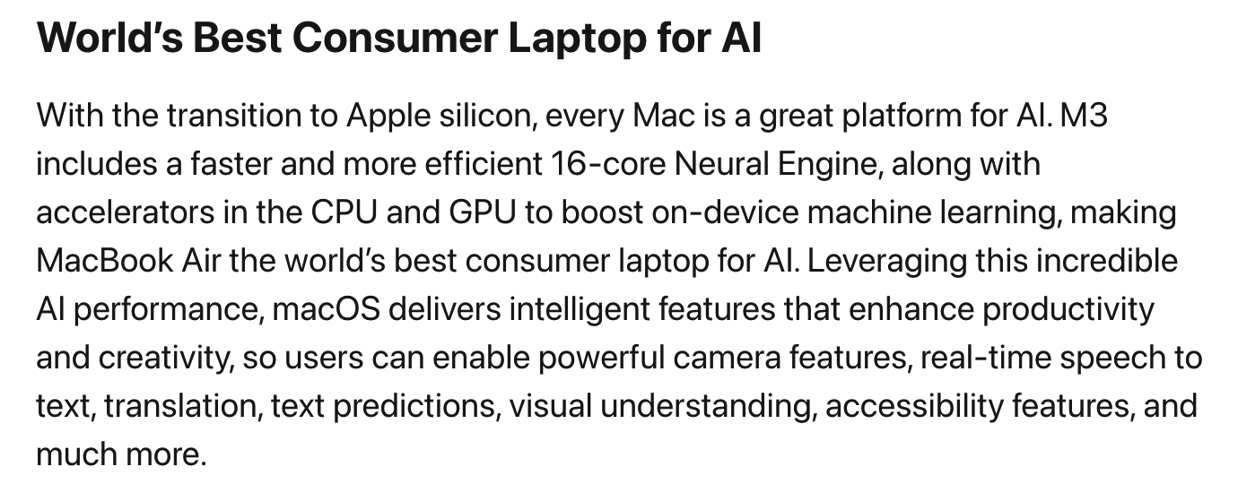 值得一提的是,Apple 在 MacBook Air 的官方新闻稿中首次提到了 AI,并用「全球最好的 AI 消费级笔记本电脑」来形容这台 M3 版 Macbook Air。