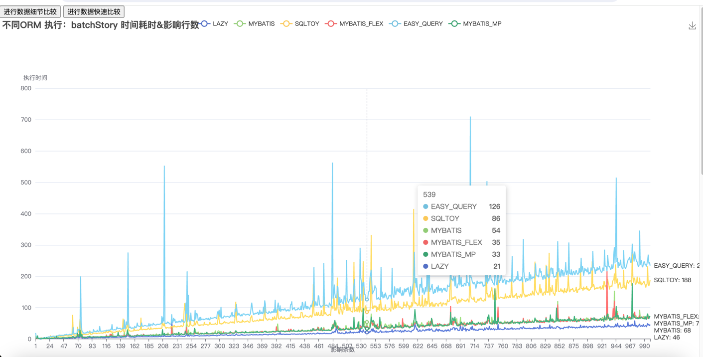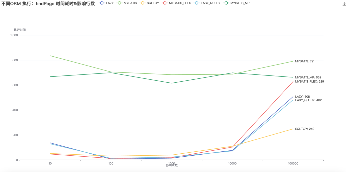 - 十万数据时,处理时间由快到慢依次是: sqltoy、lazy、easy-query、mybatis-mp、mybatis-flex、mybatis