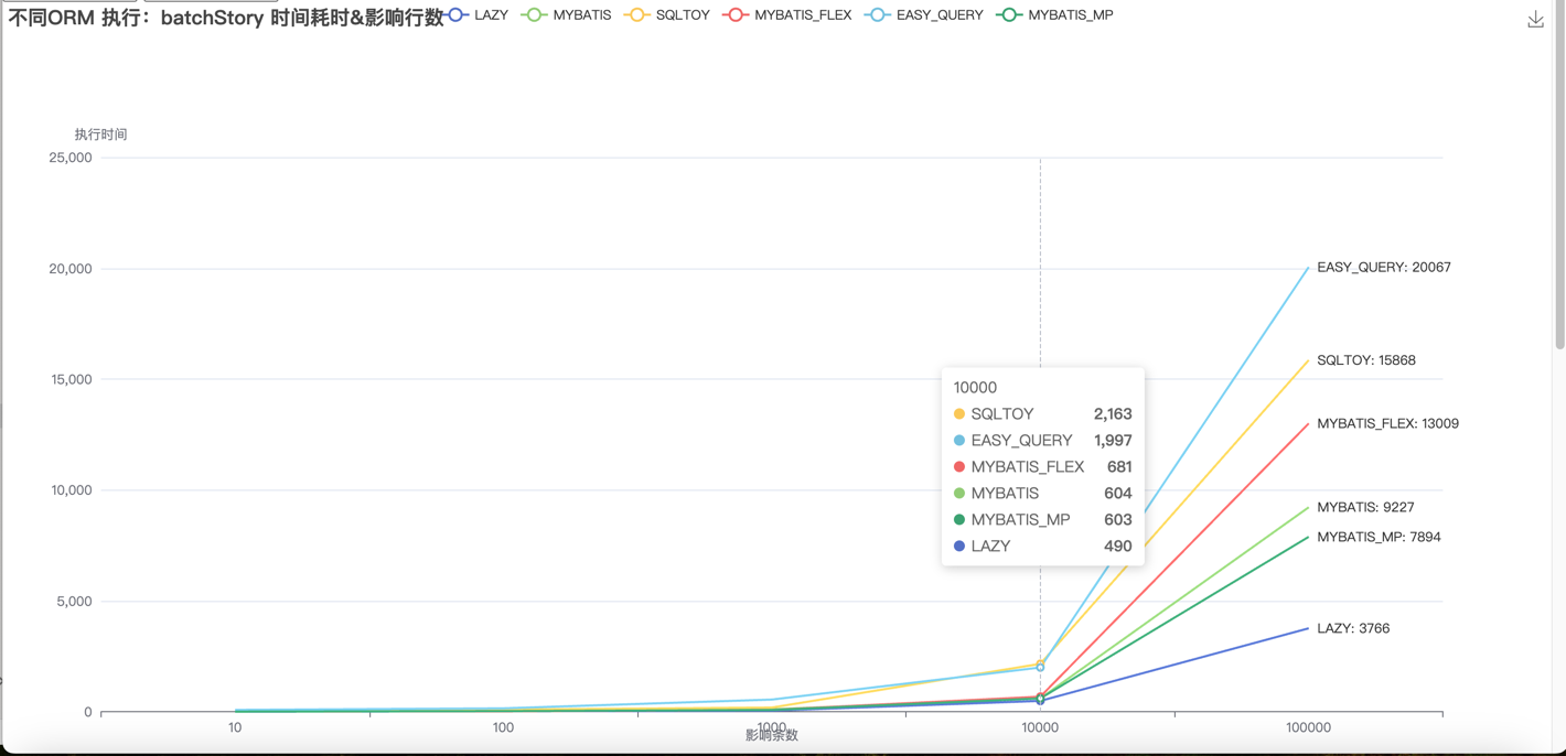 - 一万条数据以内 性能由高到低 mybatis-flex 、mybatis-mp、mybatis、lazy 性能趋于一致 sqltoy、easy-query 耗时出现明显起伏