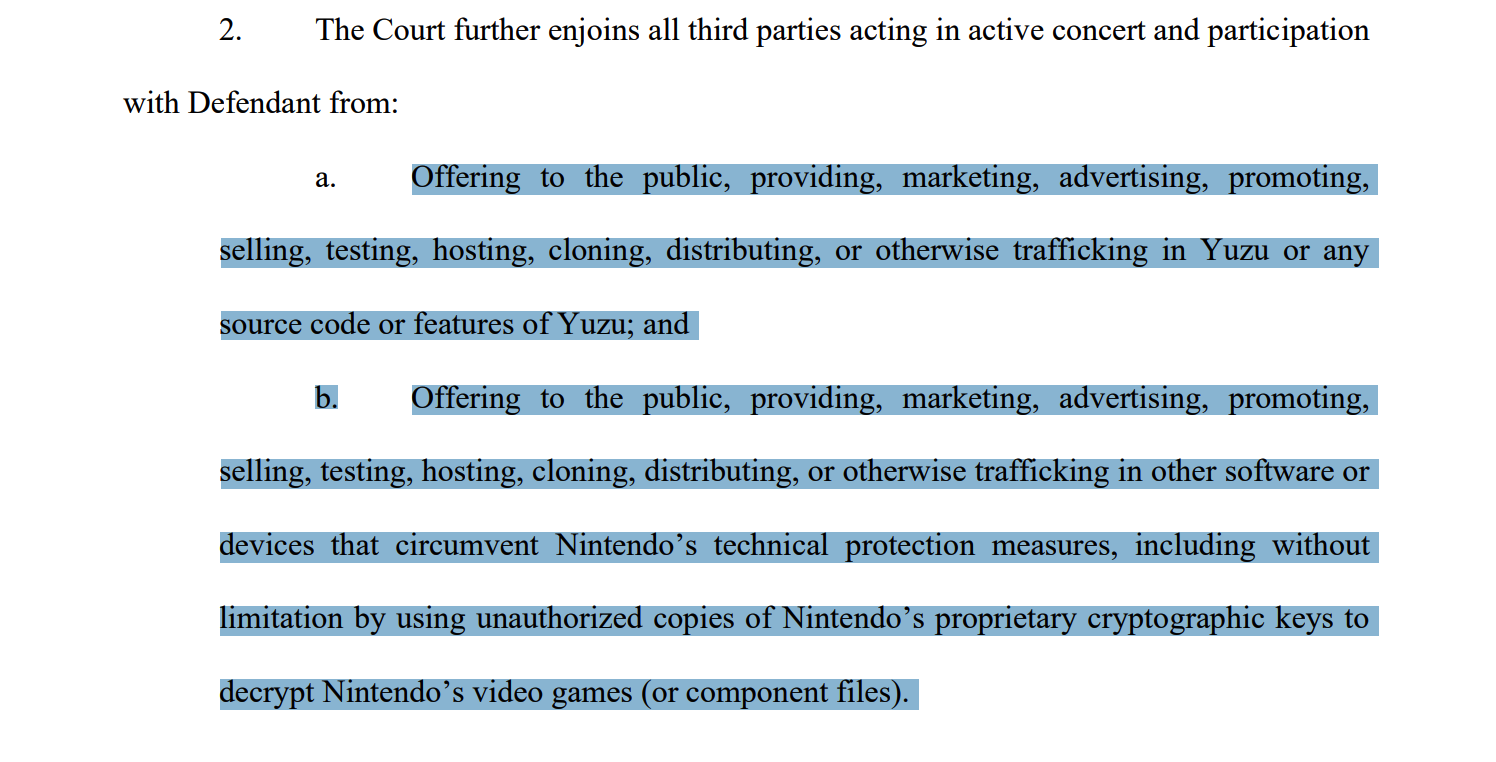 根据一份判决文件,Tropic Haze 不仅同意向任天堂支付 240 万美元,永久停止开发 Yuzu、托管 Yuzu、分发 Yuzu 的代码或功能、托管推广 Yuzu 的网站和社交媒体,或采取任何其他规避任天堂版权保护的行为。
