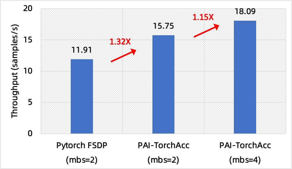 为了方便对比,我们将 PAI-TorchAcc和 PyTorch 的 micro batch size都设置为 2 进行对比。