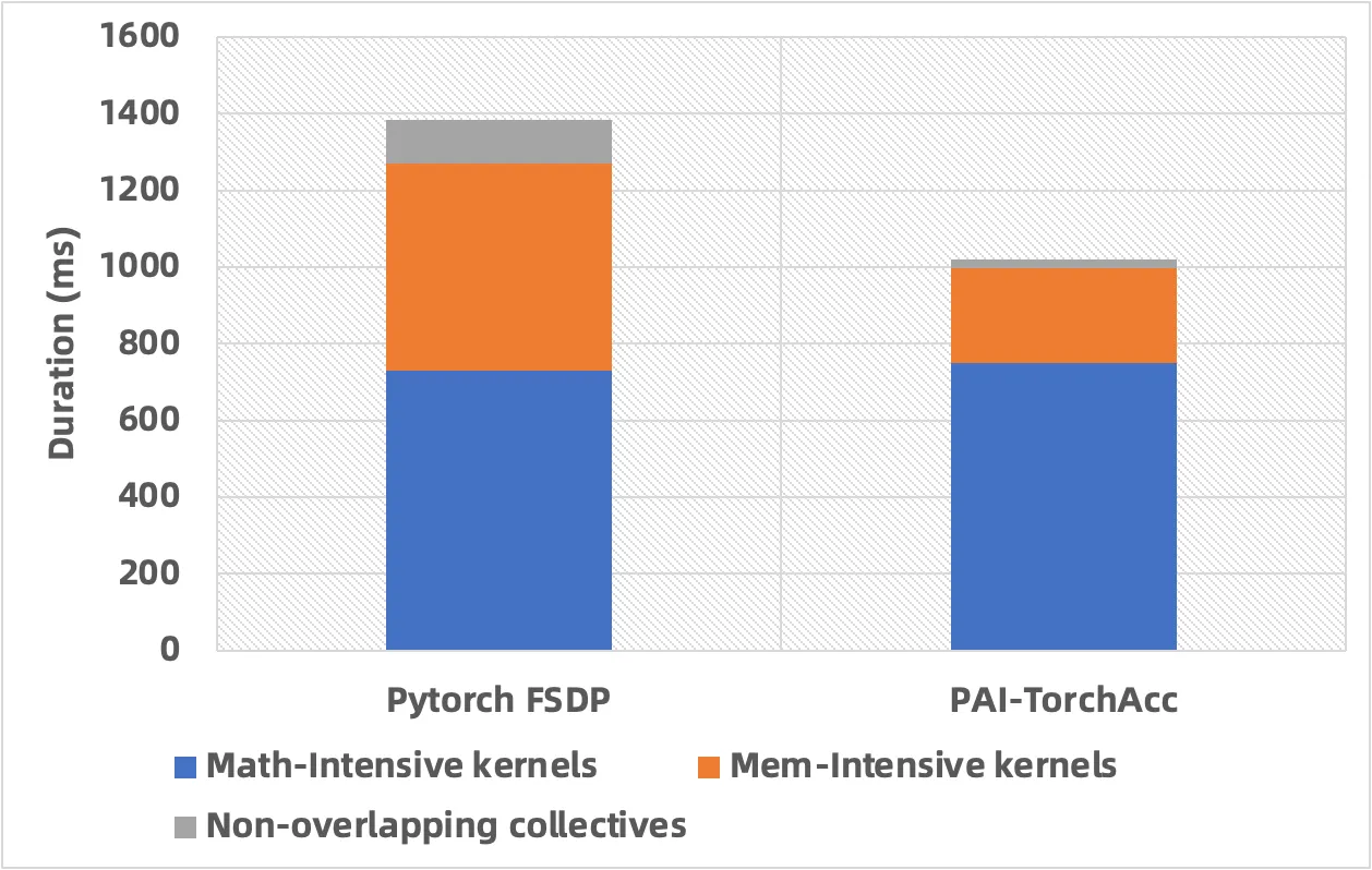 通过显存优化,PAI-TorchAcc 的最大 micro batch size 能够达到 4,而 PyTorch 的最大 micro batch size 只能达到 2,这使得PAI-TorchAcc 能够获得更高的性能加速比,这一部分的性能收益主要来自于计算密集型算子。