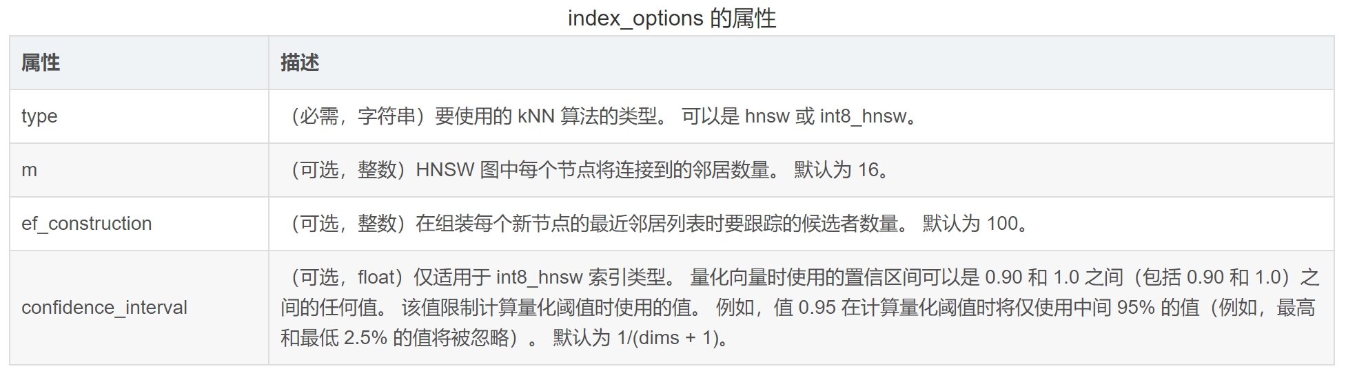 (可选*,对象)配置 kNN 索引算法的可选部分。 HNSW 算法有两个影响数据结构构建方式的内部参数。 可以调整这些以提高结果的准确性,但代价是索引速度较慢。