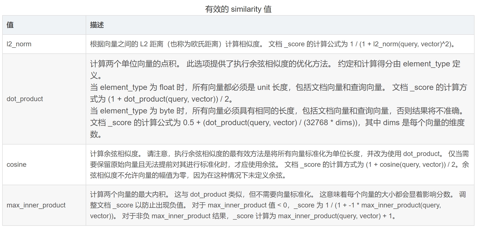 (可选*,字符串)kNN 搜索中使用的向量相似度度量。 文档根据向量场与查询向量的相似度进行排名。 每个文档的 _score 将从相似度中得出,以确保分数为正并且分数越高对应于越高的排名。 默认为余弦。