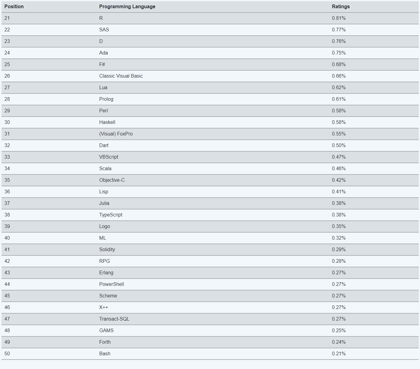 ABAP, ABC, ActionScript, Algol, Apex, APL, Awk, bc, Bourne shell, Carbon, CFML, CHILL, CLIPS, Clojure, Crystal, Curl, DiBOL, Eiffel, Elixir, Groovy, Hack, Icon, IDL, Io, J, J#, JScript, LabVIEW, Ladder Logic, LiveCode, Modula-2, NATURAL, Nim, OCaml, OpenCL, OpenEdge ABL, PL/I, PL/SQL, PostScript, Q, Racket, REXX, Ring, Smalltalk, SPARK, SPSS, Tcl, VHDL, Wolfram, Zig