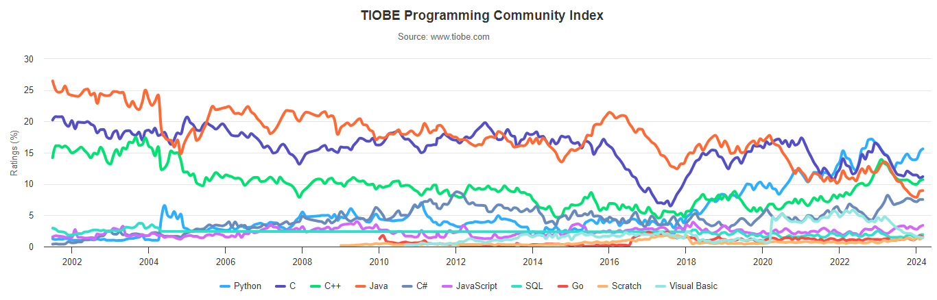 TOP 10 编程语言 TIOBE 指数走势(2002-2024)
