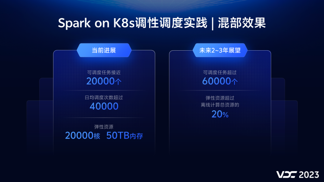 我们目前可供调度的任务接近2万个,这些任务每天调度的次数已经超过了4万次。在凌晨的高峰期,我们通过混部,能为离线任务额外增加2万核、50TB内存的计算资源。这个收益是相当可观的,我们也希望在未来的2到3年,将可调度的任务规模提升到6万个,弹性资源能够为离线计算总资源贡献20%的份额。