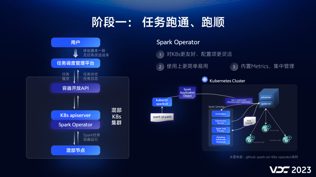 另外一个关键点是,我们选用了Spark Operator作为Spark任务容器化的方案。Spark Operator是谷歌基于K8s Operator模式开发的一款的工具,用于通过声明式的方式向K8s集群提交Spark作业。