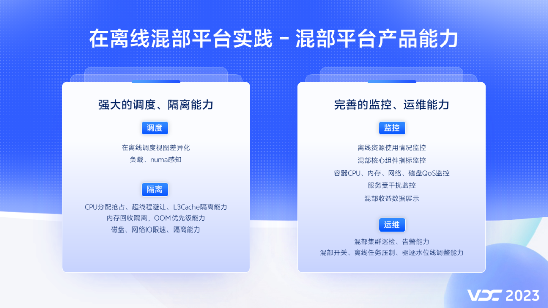 强大的调度能力解决了,我们如何将离线任务高效、合理的调度到在线服务所在的物理机上。而强大的隔离能力保障了在线服务的质量不受离线任务干扰。完善的监控和运维能力则可以让我们洞悉整个混部平台的运行情况,及时发现潜在风险,帮助运维人员更高效的完成系统和业务的运维工作,保障集群的高稳定性。