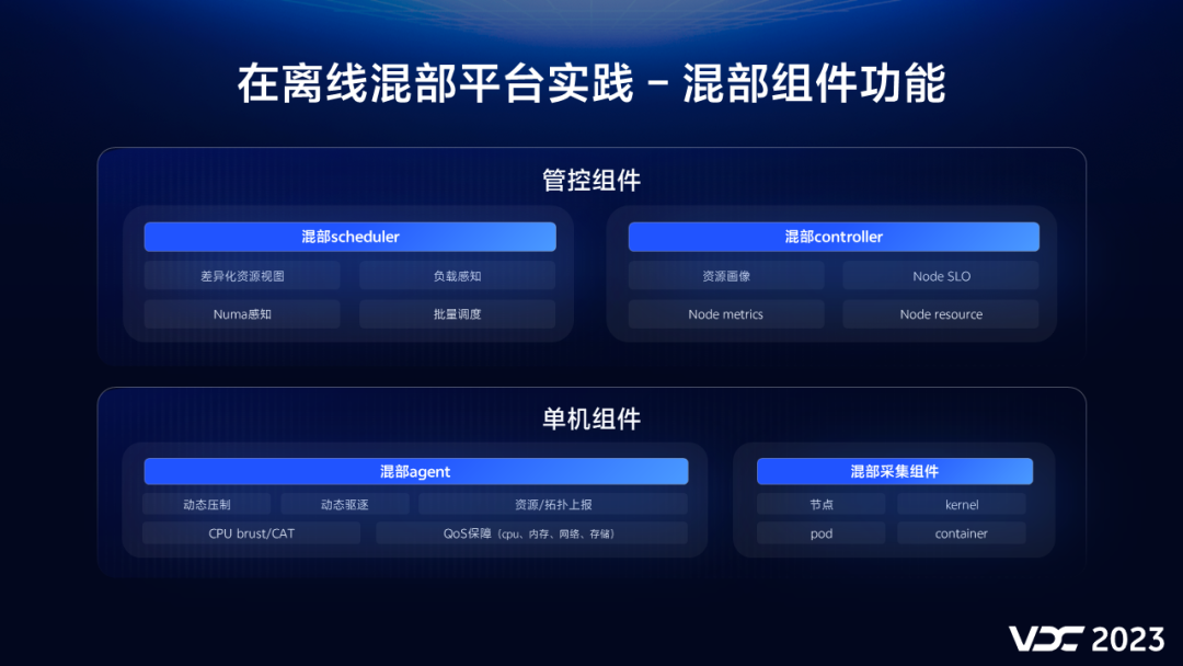 每台物理机上都会部署一个混部agent,它可以实时采集容器资源使用数据,并根据安全水位线对离线任务进行压制、驱逐等操作。