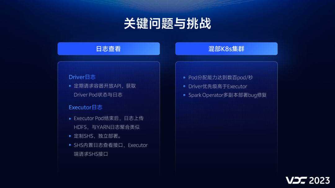 第一个是日志查看,因为Spark Operator方式并没有提供已结束作业的日志查看方式,包括driver和executor日志。在Driver侧,我们通过定期请求容器开放API,能准实时地获取Driver Pod状态与日志。在Executor侧,我们参考了on yarn的方式,Executor Pod结束后,日志上传HDFS,与YARN日志聚合类似。