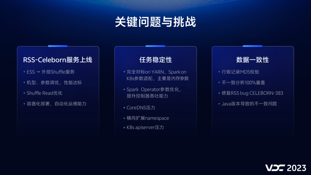 首先是我们需要为Spark选择一个外部的shuffle服务,经过技术选型和比较,我们最终选择开源的celeborn作为我们的remote shuffle service组件。我们通过对机型和参数的测试调优,使celeborn的性能达到我们的预期需求。在大规模的应用场景中,我们还发现了会存在大任务会阻塞小任务,导致shufle read变慢的问题,我们对这种情况做了参数和代码上的优化,当前社区也针对shuffle read的问题有一些待优化的改进。另外celeborn进行了容器化部署,在提升自动化运维能力的同时,也可以为混部集群提供额外的计算资源。
