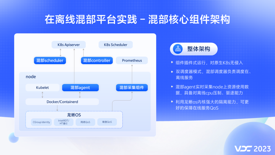 我们所有的混部组件都是以插件方式独立运行,对原生K8s无侵入。我们实现了一个混部调度器,在线和离线统一使用这个调度器,避免了多调度器资源账本冲突的问题。