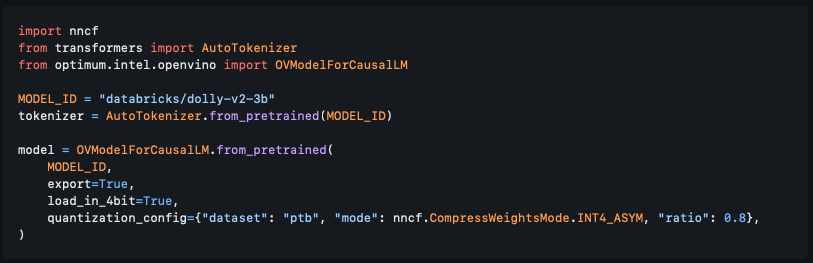 其次,虽然性能一直是一个讨论的话题,但准确性也至关重要。我们提高了 NNCF 中权重压缩算法的准确性。我们介绍了使用数据集的统计数据压缩权重的能力,并介绍了 AWQ 算法的实现,以进一步提高准确性。此外,通过我们与 Hugging Face Optimum Intel 的集成,您现在可以直接通过 Transformers API 压缩模型,如下所示:
