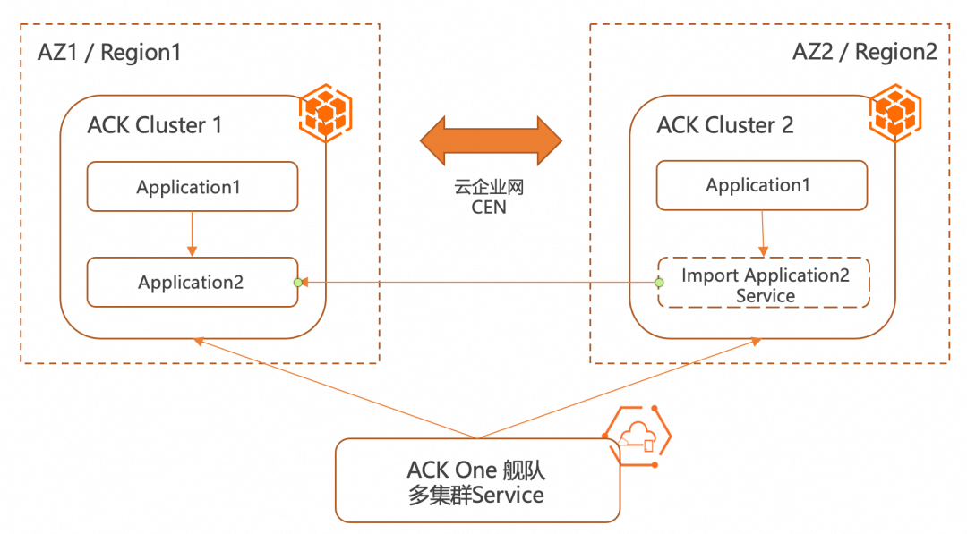 在应用迁移的过程中,由于应用的数量较多,需要分批迁移,同时应用间存在调用关系。此时,在网络打通的前提下,可以使用 ACK One 舰队多集群 Service [ 5] ,实现应用 Kubernetes Service 跨集群访问。如下图所示,ACK One 舰队多集群 Service,可以将 Cluster1 的 Applcation2 的 Kubernetes Service(包含 endpoints)注入到 Cluster2,Cluster2 上的 Application1 可以访问 Cluster1 上的 Application2。