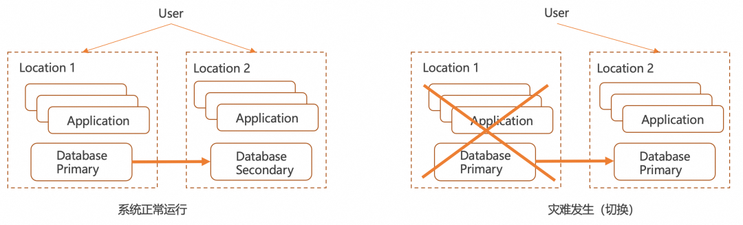在双活模式中,2 个 Location 启动相同的应用实例数,同时处理业务流量。在灾难发生时,做数据库主备切换,并切换业务流量。
