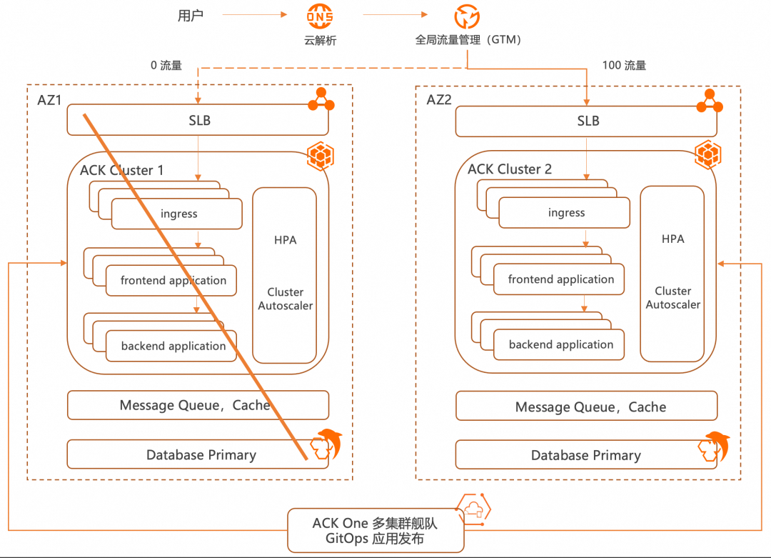 灾难事件发生,AZ 不可用时,系统主备切换,GTM 将流量切换到 AZ2,ACK Cluste2 的应用实例自动扩展,中间件和数据库多可用区高可用切换。
