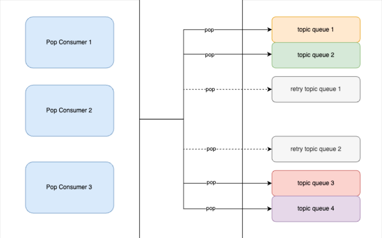 与 Push 过程相比,Pop 过程的不同之处在于它不会一直锁定 Queue。一旦 Queue 被释放,其他 Pop Consumer 实例就可以继续拉取并消费这个消息。这意味着,如果之前拉取某个 Queue 的 Pop 实例停止消费,其他实例可以接管并继续消费这个消息,避免了需要切换消费者或生产者的麻烦。