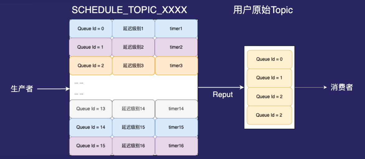 RocketMQ 5.x 中的延迟消息机制与 4.x 版本有所不同。在 4.x 版本中,延迟消息是通过一个固定的 Schedule_Topic_XXXX 来实现的,它默认支持最多16个队列。每个队列对应一个延迟级别,并且每个级别都有一个定时器(timer)与之关联。这些定时器会定时触发对应级别的延迟消息。当某个延迟级别的消息被触发后,系统会启动一个新的定时器来处理下一个延迟级别。然而,如果支持的队列数量过多,系统的负担会加重,可能会影响整体的稳定性。