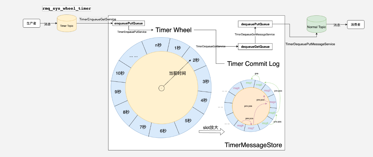在实现上,RocketMQ 5.x 通过异步线程池来处理消息的扭转和触发过程。当一条正常的消息进入系统时,它首先被发送到一个专门的 Timer Topic 中。然后,异步线程将消息转化为时间轮格式,并生成相应的 Timer Log 文件。接着,触发器服务会根据时间轮的当前位置来判断是否有定时消息需要触发,并根据 Slot 中的指针来找到并处理这些消息。