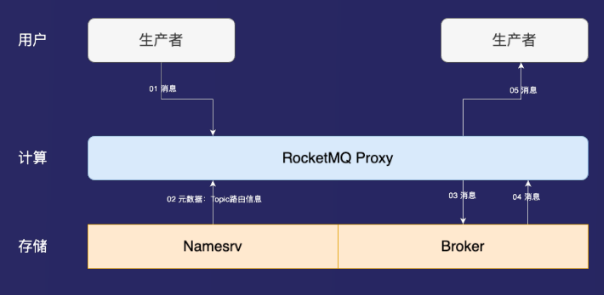 在这个新架构下,RocketMQ 的层次结构被划分为三层。最上层是用户层,负责消息的生产和消费。中间层是 Proxy 层,也被称为计算层。这一层主要负责处理客户端的连接请求,执行路由计算,以及处理消息的续期等关键逻辑。最下层是存储层,包括 Namesrv 和 Broker。Namesrv 仍然负责存储元数据,如 Topic 的路由信息和 Broker 的列表。而 Broker 则负责存储实际的消息数据、Consumer 队列以及索引等信息。