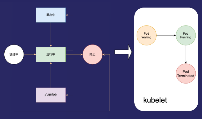 上图中右边的部分其实就是 Kubelet,K8S 对于进程状态的实现,Kubelet 的实现。当进程启动重新部署后,Kubelet 会帮用户自动的把这三个状态进行扭转,直到这个状态为最终态为止。