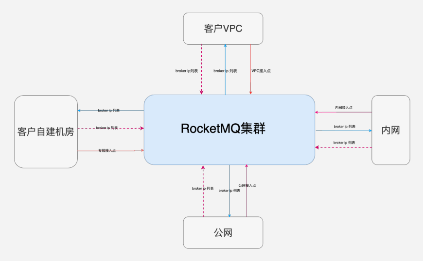 当用户尝试访问 RocketMQ 集群时,他们通常首先从服务器获取路由信息,这些信息会返回一个IP列表,然后用户通过这个列表与 RocketMQ 集群进行交互。但是,难点在于如何让这同一套 RocketMQ 集群能够适应并处理上述所有不同场景的网络接入需求。
