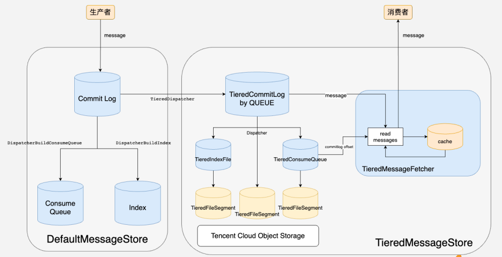 在 5.x 版本中,分层存储的实现是通过新增一个 Dispatcher 来实现的。这个新的 Dispatcher 会被注册到原有的 Dispatcher 中。当用户写入数据时,数据会异步地分发到分层存储的 Commit Log 里。一旦数据被分发到这里,新的 Dispatcher 会负责将数据最终分发到 Index File 或 Consumer Queue 中。这些 Index File 和 Consumer Queue 的底层实际上是通过腾讯云上的对象存储来实现的。因此,文件会被存储在腾讯云的对象存储里。这个异步分发过程与 Commit Log 的分发过程非常相似。