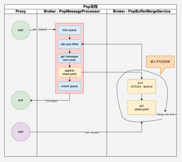 上面这个图展示了 Pop 消费在 Broker 端拉取消息以及进行 ACK 确认的整个过程。