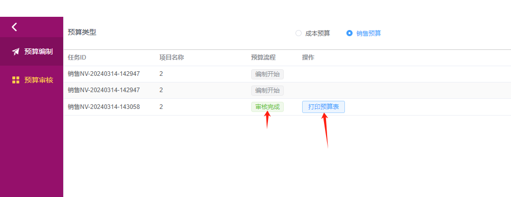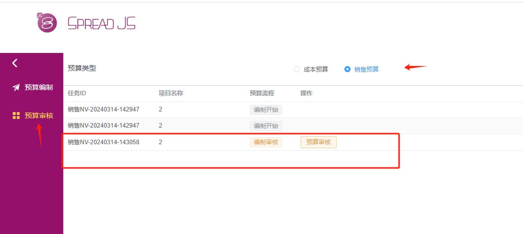 此时点击“预算审核”,预算类型设置为“销售预算”,可以看到有一条待审核的标签,点进去看看。