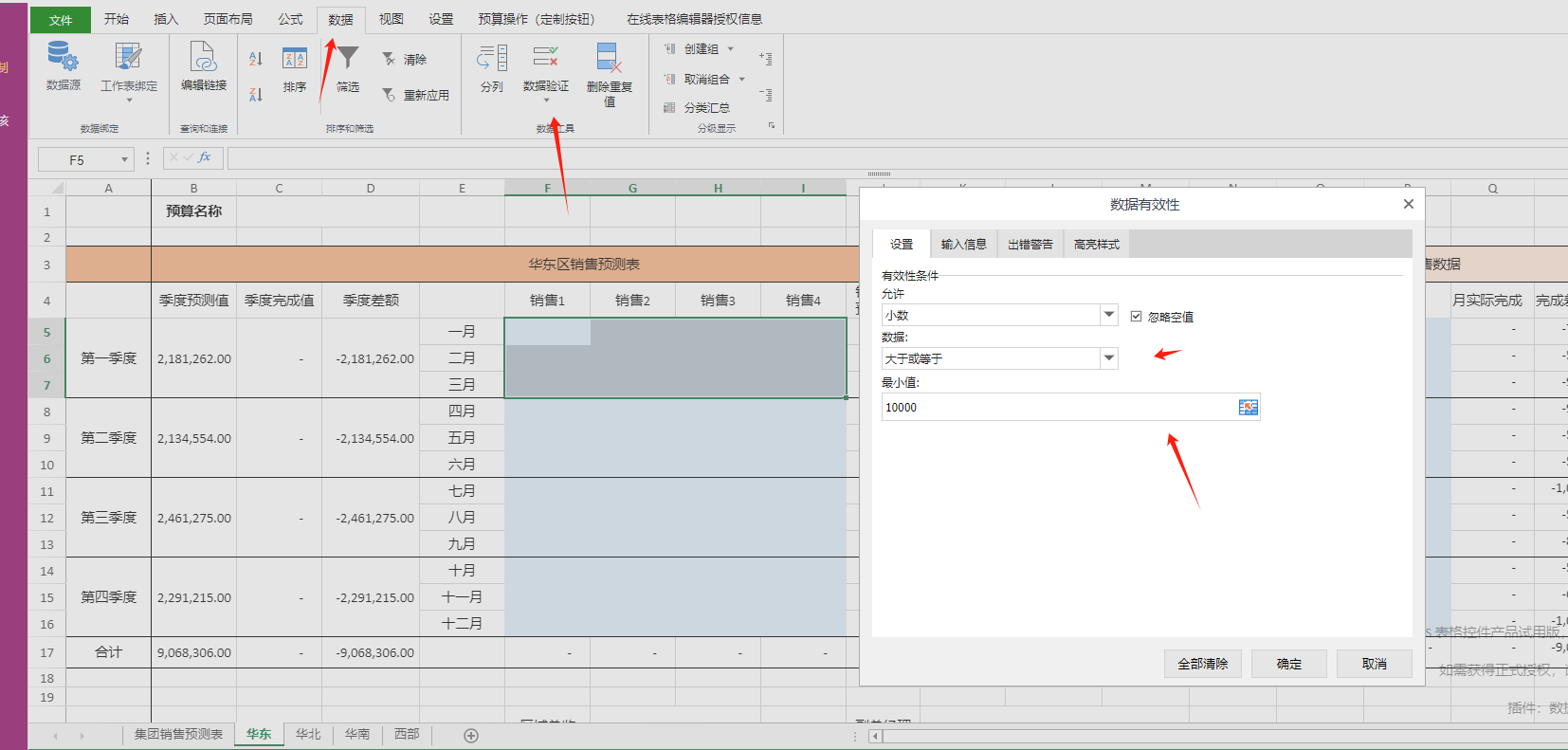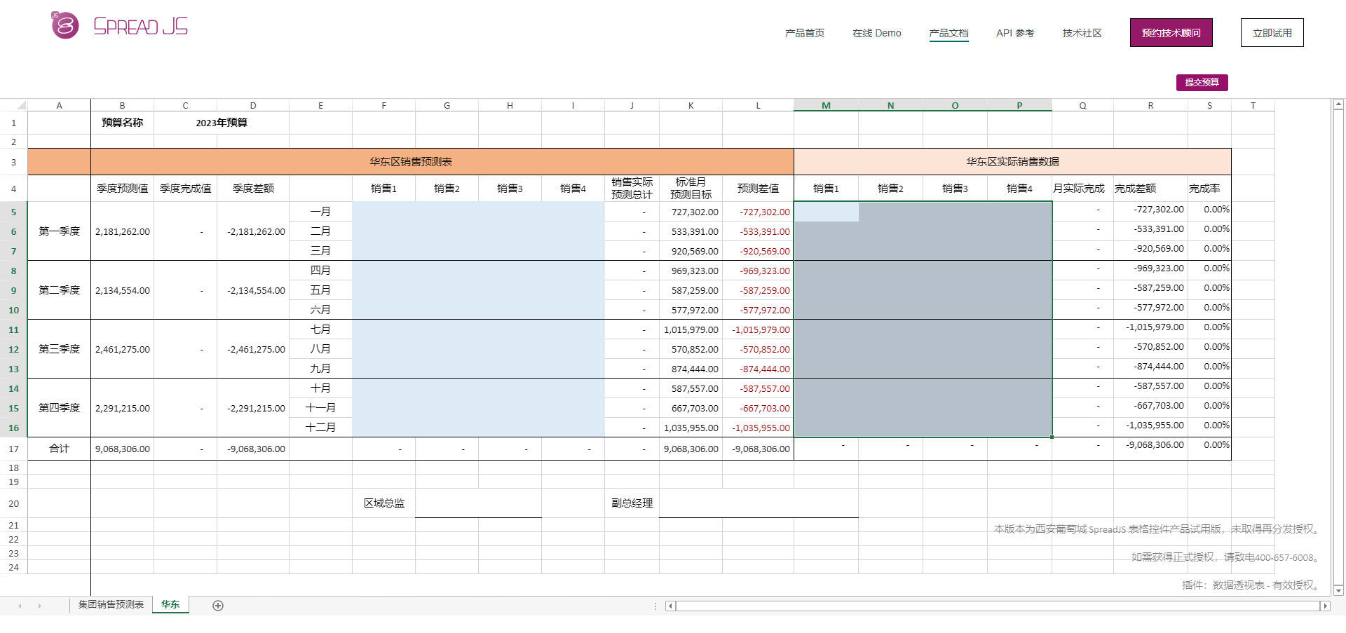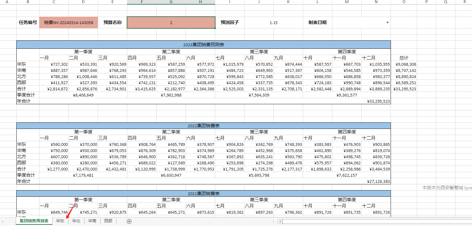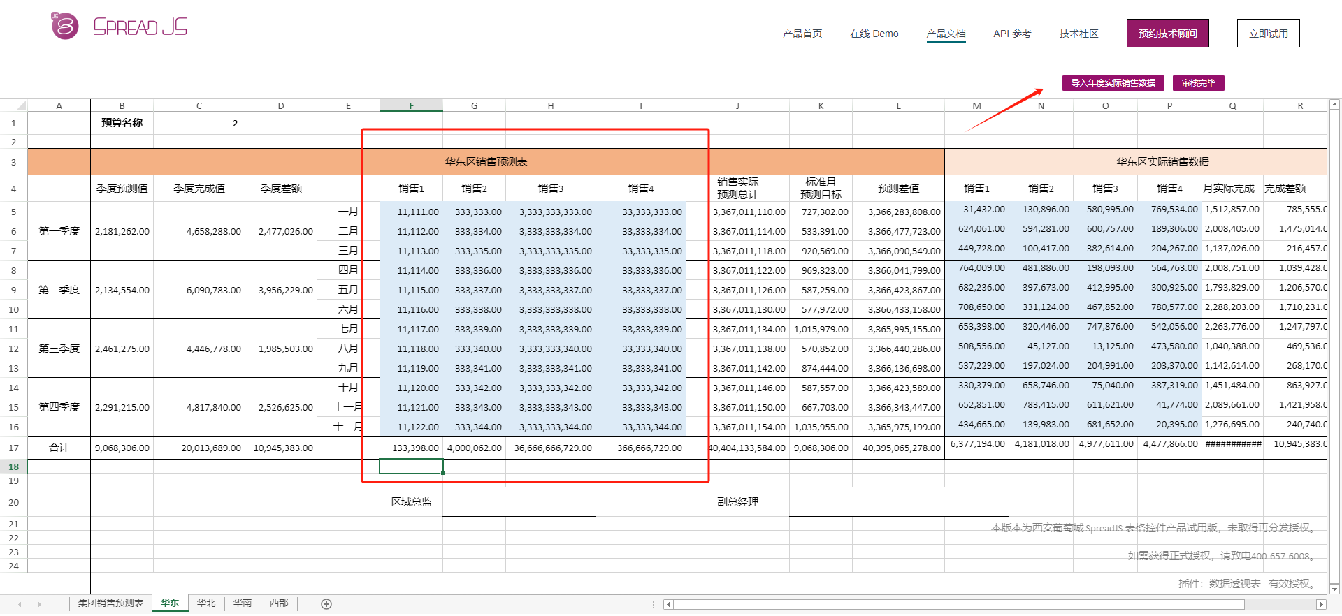 这个时候就看到了华东部门经理填写的销售预测数据,这个时候点击右上角的“导入年度实际销售数据”看看。