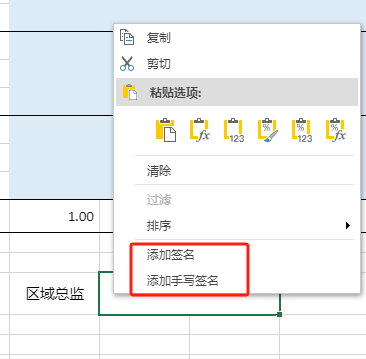 当经理设置完预算后,可以在区域总监单元格右键,看到多出来两个菜单“添加签名”和“添加手写签名”。