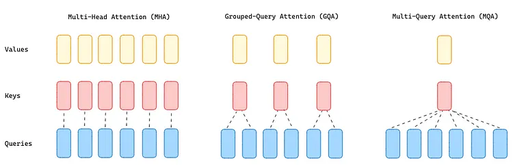 自回归解码器的推理过程(Autoregressive decoder inference)对于 transformers 来说是一个瓶颈,因为加载多头注意力层(MHA)中的所有注意力头(queries、keys 和 value)(attention queries, keys, and value heads)需要大量的内存资源。为了解决这一问题,Mistral AI 开发了Multi-Query Attention(MQA)[6],它只使用单个 key 和 value,但在注意力层中使用多个注意力查询头(query heads),从而显著减少了所需的内存。然而,这种解决方案可能导致模型质量下降和训练不稳定,因此 T5 和 Llama 等开源 LLM 都选择拒绝使用这种方法。