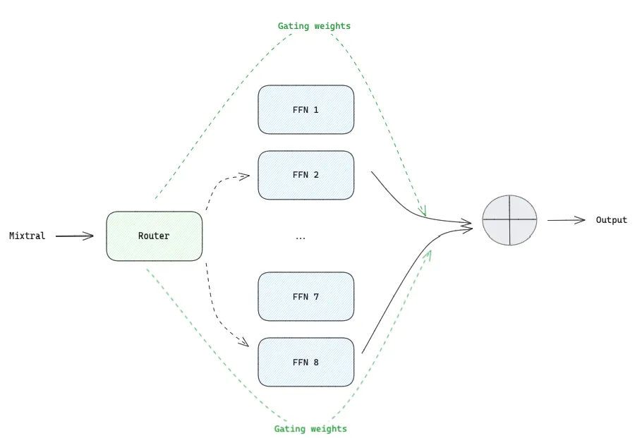 - 稀疏混合专家层(Sparse Mixture of Experts layers) :用于取代密集的前馈神经网络(FFN)层。例如,Mixtral 8x7B具有8个SMoE层,即8个专家模型,每个专家模型专门处理一组 tokens 。例如,可以是标点符号专家模型、视觉描述专家模型或数字专家模型。
