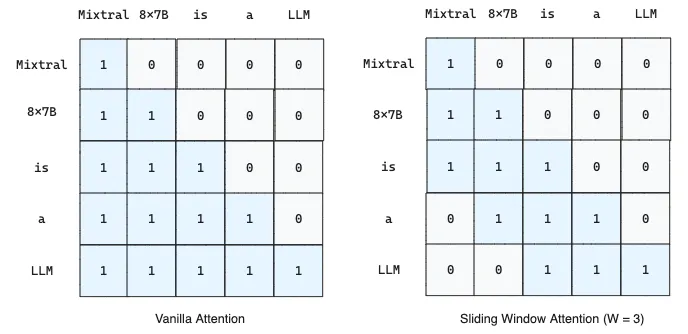 图 3:Vanilla Attention 和 Sliding Window Attention 在 Memory 方面的差异(image by author)