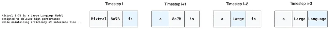 回到之前的例子,窗口大小为3。如图5所示,在处于第 i+1 个时间步(time step)时,如果模型要生成第四个 token ,第一个 token 将会被替换。