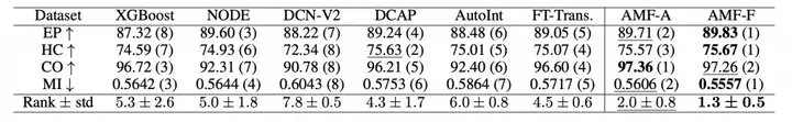 我们一共测试了包含传统树模型(XGBoost)、树架构深度学习方法(NODE)、高阶特征交互(DCN-V2、DCAP)以及Transformer派生架构(AutoInt、FT-Trans)在内的六个基准算法以及两个AMFormer实现(分别选择AutoInt、FT-Trans做基础架构,即AMF-A和AMF-F),结果汇总在表2中。