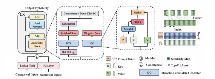 算术模块的关键组件包括并行注意力机制和提示标记。为了补偿需要算术特征交互的特征,我们在AMFormer中配置了并行注意力机制,这些机制负责提取有意义的加法和乘法交互候选者。这些交互候选随着会沿着候选维度被串联(concatenate)起来,并通过一个下采样的线性层进行融合,使得AMFormer的每一层都能有效捕捉算术特征交互,即特征上的四则算法运算。为了防止由特征冗余引起的过拟合并提升模型在超大规模特征数据集上的伸缩,我们放弃了原始Transformer架构中平方复杂度的自注意力机制,而是使用两组提示向量(prompt token vectors)作为加法和乘法查询。这种方法为AMFormer提供了有限的特征交互自由度,并且作为一个附带效果,优化了内存占用和训练效率。