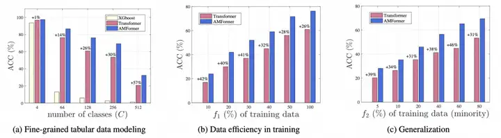 图2:合成数据集上的结果对比。图中+x%表示AMFormer相比Transformer的相对提升。