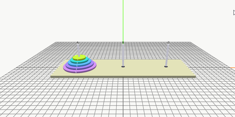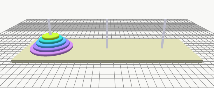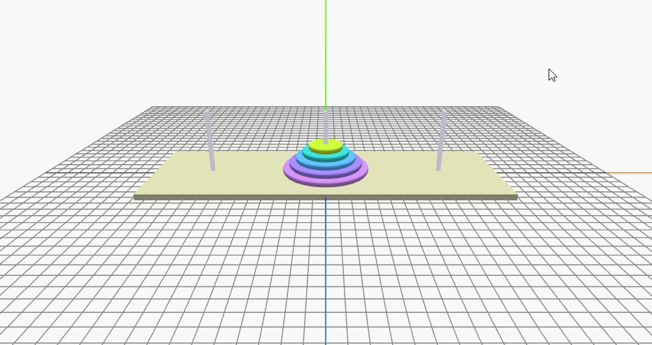 汉诺塔中的盘子是按一定的大小规律堆叠在一起的,多个盘子的大小可以使用等比数列来控制。我们只需设定最大的一个盘子的尺寸,就能利用等比数列通项公式 a(n) = a1 × r^(n-1) 算出其他盘子的尺寸来。同时,盘子是沿 y 轴堆叠在一起的,只需算出第一个盘子的坐标,就能根据盘子所在堆叠层数算出其 y 轴坐标来。addPlates 代码实现如下: