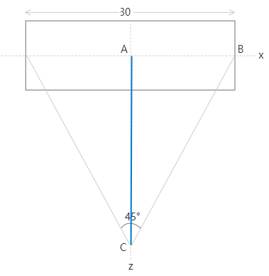 如果我们从桌台正上方,也就是通过场景 y 轴往下看,就会看到桌台的俯视图。一图胜千言,下图中 AC 的长度就是相机在 z 轴上的坐标。